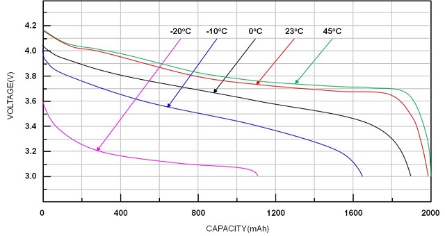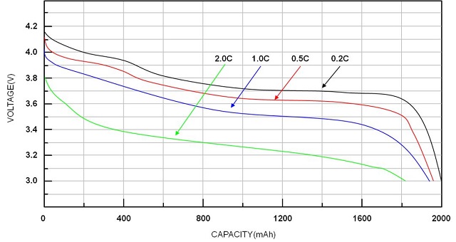 下圖顯示不同放電率下電壓與電池容量的關(guān)系。放電率愈高,電池容量愈低。溫度低時(shí),電池容量也會(huì)降低。