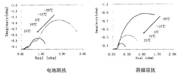 電池阻抗主要體現(xiàn)為電化學(xué)反應(yīng)阻抗,而歐姆阻抗相對較小。由下圖可知。隨著溫度的下降,電池阻抗逐漸上升,且下降至0°C以后,阻抗速度增大,陰極阻抗呈類似的趨勢,從數(shù)值上來看,電池的阻抗主要來源于陰極阻抗的貢獻(xiàn)。