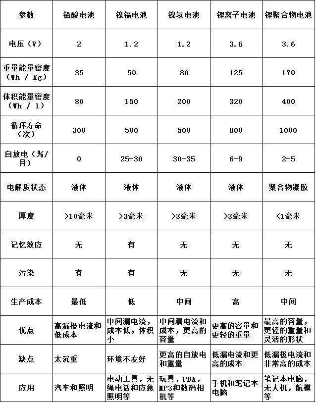 下表比較了它們的性能和應用。目前,最受歡迎的可充電電池是消費電子行業(yè)中的鎳鎘電池(Ni-Cd),鎳氫電池(Ni-MH)和鋰離子電池Li-Ion。