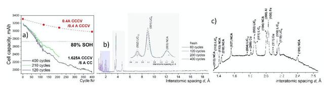 使用三只電池進(jìn)行循環(huán),分別循環(huán)120次、210次和400次,該電池的初始容量為3170mAh,經(jīng)過120次循環(huán)后電池剩余容量為2528mAh,經(jīng)過210次循環(huán)后剩余容量為2346mAh,經(jīng)過400次后剩余容量為1950mAh,表明該電池循環(huán)性能較差,在經(jīng)過120次循環(huán)后電池容量就降低到了80%以下,這主要是受到作者采用的充放電電流比較大的影響。下圖b為新電池和循環(huán)老化后的電池的單頻中子衍射圖譜,從下圖b中能夠看到該圖譜主要是由NCA正極、石墨相1和相2,Al箔和Cu箔,以及18650電池的不銹鋼外殼構(gòu)成。