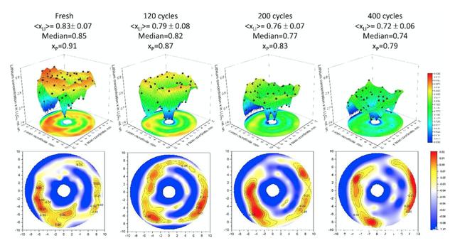 下圖最下層是Li的分布圖,其中淺色區(qū)域?yàn)長i的平臺濃度區(qū)域,從下圖可以看到隨著循環(huán)次數(shù)的增加,平臺濃度區(qū)域數(shù)量在減少,同時(shí)Li含量較高的深色區(qū)域主要集中在電芯的外部區(qū)域,表明隨著循環(huán)次數(shù)的增加電池內(nèi)部的Li濃度分布均勻性也在逐漸降低。