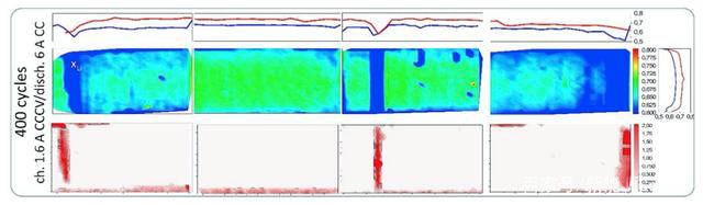 下圖為根據(jù)上述的衍射結(jié)果制作的Li在石墨負(fù)極中分布的二維圖,從圖中能夠看到在新鮮電池中除了個(gè)別的地方,Li在負(fù)極中的分布還是比較均勻的,鋰濃度比較低的部分主要正極活性物質(zhì)比較少的地方,例如電極的開頭和結(jié)尾,以及極耳位置。