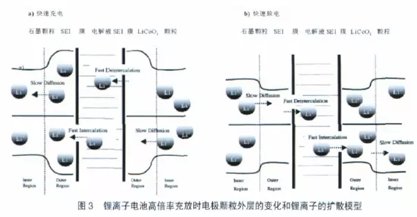 在這些過(guò)程中,人們一般認(rèn)為鋰離子的固相擴(kuò)散系數(shù)(見(jiàn)表1)比液相擴(kuò)散系數(shù)(約10-6cm2/s)小得多,鋰離子的固相擴(kuò)散是充放電過(guò)程中的動(dòng)力學(xué)控制因素。因此人們把大量的精力放在測(cè)量擴(kuò)散系數(shù)上,采用多種方法(GITT、PITT、EIS等)對(duì)多種電極材料(MCMB、天然石墨、碳纖維等)的擴(kuò)散系數(shù)進(jìn)行了研究(如表1所示),發(fā)現(xiàn)所得結(jié)果隨著測(cè)量方法、材料的種類(lèi)、表面粗糙程度、荷電狀態(tài)的變化而變化,并不能很好地確認(rèn)鋰離子在負(fù)極材料中的擴(kuò)散就是充放電過(guò)程中的動(dòng)力學(xué)控制因素,在高倍率充放電時(shí)更是如此。因?yàn)樵诟弑堵食浞烹姇r(shí),鋰離子要快速地從電解質(zhì)溶液遷移到負(fù)極材料中,影響因素變得更加復(fù)雜,動(dòng)力學(xué)控制因素也難以定論。如Wang在研究聚合物鋰離子電池在高倍率(1C)和低倍率(0.2C)兩種制度下充放電時(shí)體積的變化時(shí),發(fā)現(xiàn)體積的變化除隨著充電電流大小和充電狀態(tài)的不同發(fā)生變化外,還在開(kāi)路狀態(tài)下有一定變化,他們把這種現(xiàn)象歸因于鋰離子在電極活性物質(zhì)中擴(kuò)散慢和電極顆粒的外層結(jié)構(gòu)變化慢上,認(rèn)為擴(kuò)散是鋰離子電池高倍率充放的控制因素,并提出了高倍率充放電時(shí)電極顆粒外層的結(jié)構(gòu)變化和鋰離子擴(kuò)散的模型(如圖3 所示)。