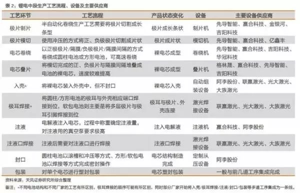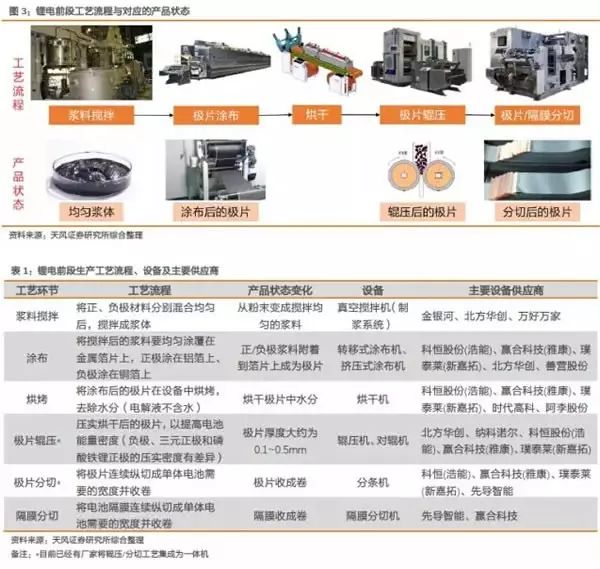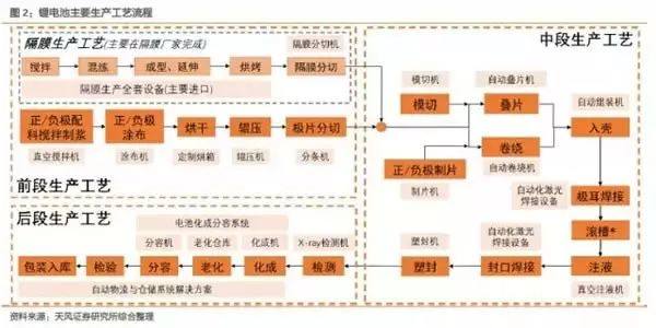 鋰電池生產(chǎn)前階段對(duì)應(yīng)的鋰設(shè)備主要有真空混合機(jī)、涂布機(jī)、輥壓機(jī)等;中間工序主要包括模切機(jī)、繞線機(jī)、層壓機(jī)、噴液機(jī)等。;后端流程包括化學(xué)成型機(jī)、體積檢測(cè)設(shè)備、流程倉儲(chǔ)和物流自動(dòng)化等。此外,電池組生產(chǎn)需要電池組自動(dòng)化設(shè)備。