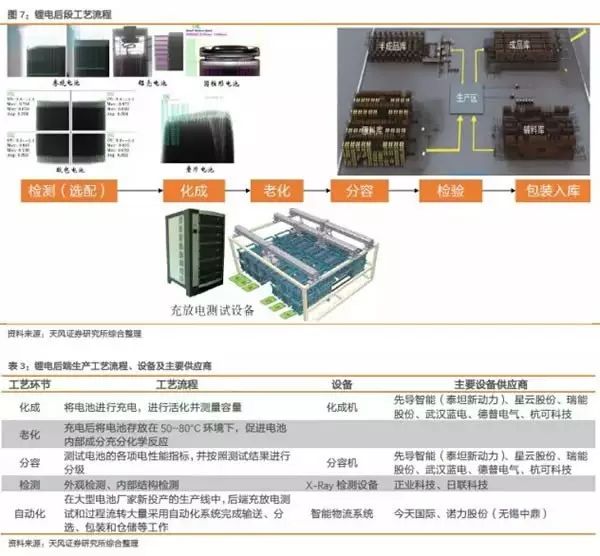 鋰電后段生產(chǎn)工藝主要為分容、化成、檢測(cè)和包裝入庫四道工序,占生產(chǎn)線價(jià)值量約35%?;珊头秩葑鳛楹蠖喂に囍凶钪饕h(huán)節(jié),對(duì)成型的電池進(jìn)行激活檢測(cè),由于電池的充放電測(cè)試周期長(zhǎng),因此設(shè)備的價(jià)值量最高?;晒に嚨闹饕饔迷谟趯⒆⒁悍庋b后的電芯充電進(jìn)行活化,分容工藝則是在電池活化后測(cè)試電池容量及其他電性能參數(shù)并進(jìn)行分級(jí)?;珊头秩莘謩e由化成機(jī)和分容機(jī)通常由自動(dòng)化分容化成系統(tǒng)完成。