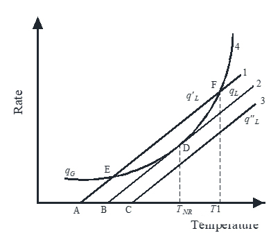圖2. 熱自燃理論:A、B、C三種環(huán)境溫度條件下反應(yīng)速率、系統(tǒng)散熱速率與溫度之間的關(guān)系。A是安全環(huán)境溫度;B臨界危險(xiǎn)溫度,樣品溫度可以達(dá)到TNR,如果環(huán)境溫度超過(guò)B,產(chǎn)熱速率大于散熱速率,系統(tǒng)將進(jìn)入熱失控狀態(tài)。