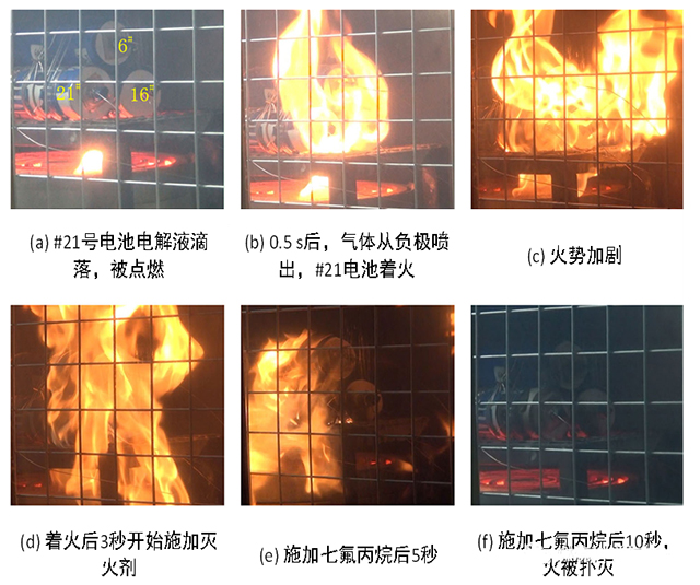 由于鋰離子電池火災(zāi)事故頻頻繁發(fā)生,什么樣的滅火劑更適合電池火災(zāi),最佳的滅火方式和滅火方式受到了廣泛關(guān)注。中國(guó)科學(xué)院項(xiàng)目組孫金華、王慶松長(zhǎng)期致力于鋰電池滅火劑的優(yōu)化和基于鋰離子電池特性的滅火技術(shù)的研究與開(kāi)發(fā)。圖10顯示了該組使用七氟丙烷滅火器滅火大型鋰離子電池的實(shí)驗(yàn)過(guò)程。一般來(lái)說(shuō),低粘度更適合于鋰離子電池滅火,而不適合保溫類(lèi)型,常規(guī)的二氧化碳滅火劑,單電池滅火效果較好,水冷卻效果較好,但電池?cái)?shù)量較大,所需的電路較短。